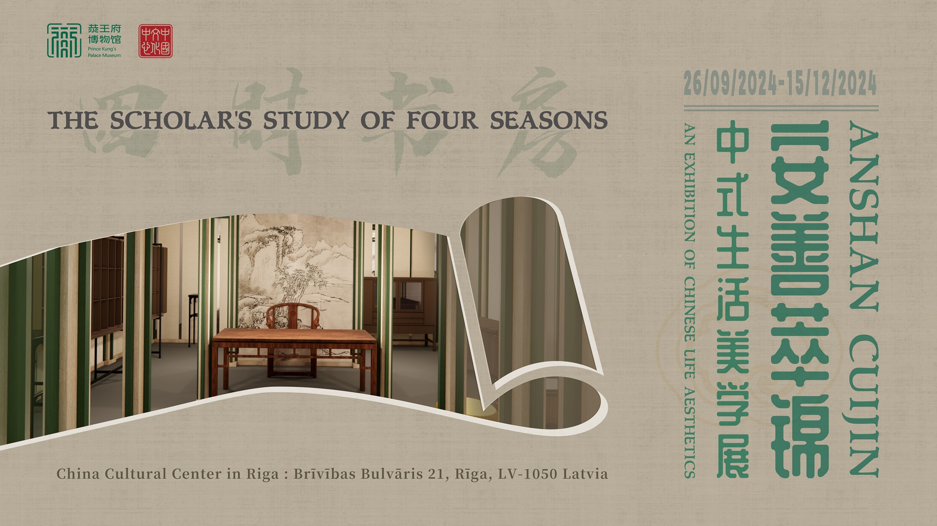 展览由18luck官方下载与里加中国文化中心联合主办,通过“雪霁堂”“花相斋”“风和轩”“月下庐”四个展示空间构筑成一组“四时书房”生活体验场景,展现中国人一年四季的传统生活美学。展览是“恭王府·安善堂”传统生活美学馆海外巡展的第一站。