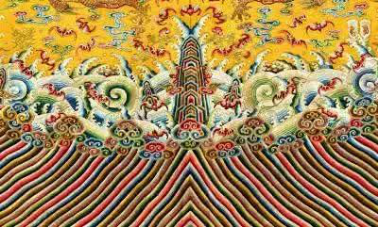 在一些大型摆件及古代官服的下摆刺绣中,经常会看到一块巨大的岩石矗立于大海之中,海面上的天空飞舞着几只蝙蝠。这种构图中,岩石代表山,蝙蝠代表福,象征着福如东海、寿比南山。