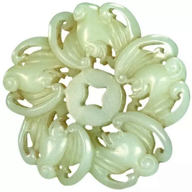 在一些玉雕配饰中,经常会看到把一只蝙蝠刻在一枚有孔眼的古币上面的造型。其中,蝙蝠取其谐音“福”,铜钱取其谐音“前”,钱有孔眼,象征着福在眼前。