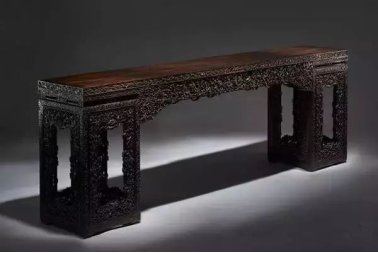 云蝠纹使用极广,既有平面描绘的,如绘画、瓷器、画珐琅、织绣品,也有立体雕刻的,如木雕、玉雕、石雕、漆雕、套玻璃、牙角雕等。云纹代表高升如意,蝠纹代表福意绵绵,合起来有“万福流云”之意。京作宫廷家具上常用此纹,如“紫檀云蝠纹架几案”。此案案面侧沿雕云蝠纹,面下两个架几上亦雕云蝠纹。其蝠纹采用写实手法,形象逼真,活灵活现。