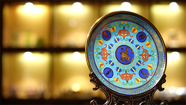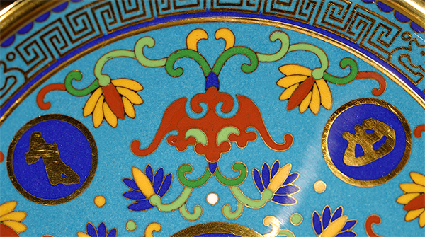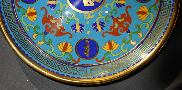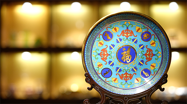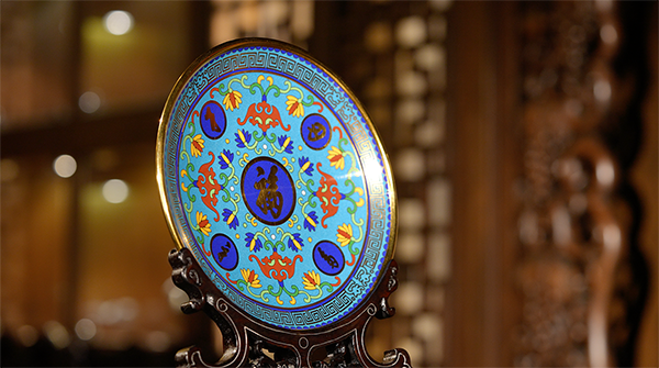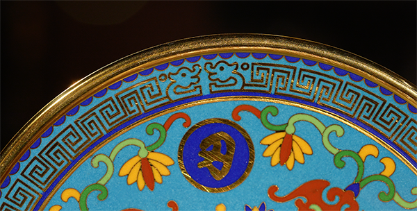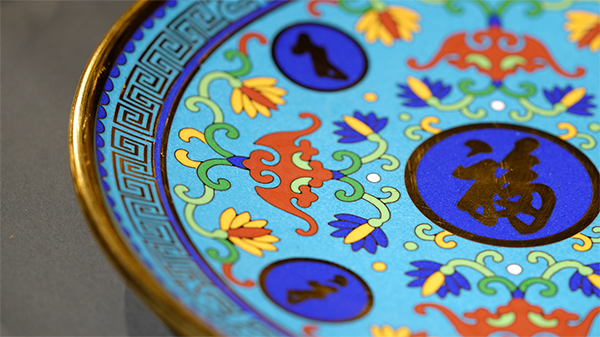 采用景泰蓝掐丝工艺制成。盘心饰有康熙御笔“天下第一福”,四周饰“子”“才”“田”“寿”的福字分解,并有“蝙蝠纹”与“万寿藤”之称的缠枝莲纹等吉祥花纹环绕,寓意福寿双全。