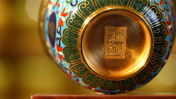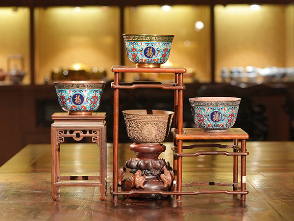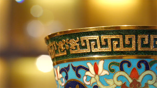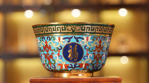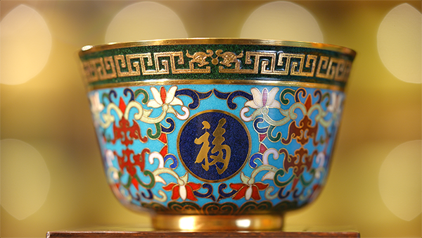 采用景泰蓝、镀金和錾刻工艺制成。碗正中镀有康熙御笔的“天下第一福”,寓意四方来福;四周镀有“万寿藤”之称的“缠枝莲纹蝠”和“蝠纹”,寓意“福寿双全”;碗口刻有象征皇室地位的夔龙纹,寓意天之骄子、身份尊贵。