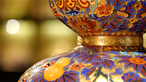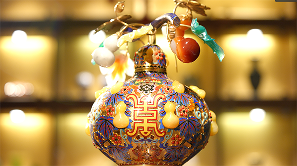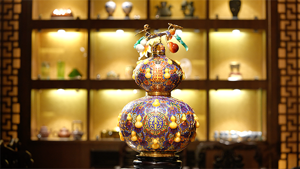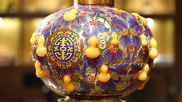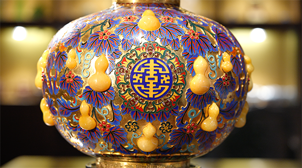 采用景泰蓝掐丝和宝石精雕嵌制工艺制成。葫芦谐音“福禄”,与“五福捧寿”的点缀结合,寓意福禄万代、福寿双全。