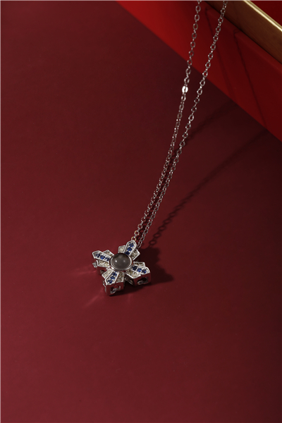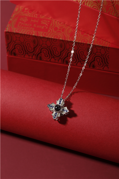 这款项链设计独特,中间镶嵌的人造宝石中微雕有101个福字,围绕着百福的周围又镶嵌了蓝白锆石,犹如星光闪耀,寓意福星高照、福气围绕。