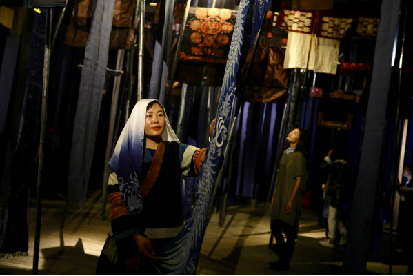 在本次展览中,艺术家邬建安邀请来自贵州织金的手工艺人杨晓珍女士,以及贵州丹寨宁航蜡染的染娘们共同合作,创作了融合当代艺术观念与传统手工艺,并尝试突破原有边界的艺术作品。这些作品与来自贵州的百余根蓝靛竹子所构成的竹林,共同呈现了艺术家对于传统手工艺在当今时代文化发展中的丰富想象力。同时这也是一次当代艺术家与当地手工艺人合作,对于苗族传统手工艺语言的全新探索与实践。