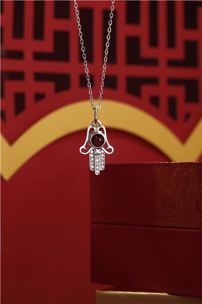 18k金材质,手工制作。以手作为造型,中央镶有人造宝石,宝石采用微雕工艺,刻有101个福字。项链上还镶嵌小钻石一颗,小巧精致,寓意福在手中、掌上明珠。