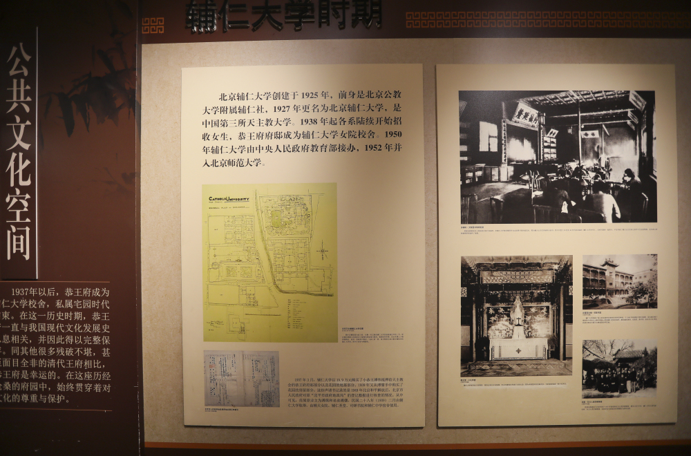 1937年以后,恭王府成为辅仁大学校舍,私属宅园时代结束。在这一历史时期,恭王府一直与我国现代文化发展史息息相关,并因此得以完整保存。同其他很多残破不堪,甚至面目全非的清代王府相比,恭王府是幸运的。在这座历经沧桑的府园中,始终贯穿着对文化的尊重与保护。