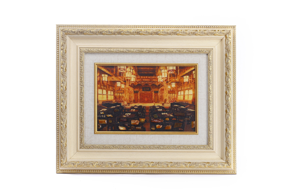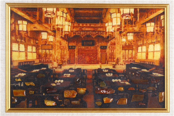 大戏楼是恭王府的重要建筑,著名的三绝之一。将天然琥珀与手绘大戏楼结合,将建筑古香古色之美展现得淋漓尽致。手工镶嵌的大颗粒琥珀,既增加了画面的立体感,使整幅画栩栩如生,也是在座来宾尊贵身份的体现,同时赋予富贵人生的美好寓意。