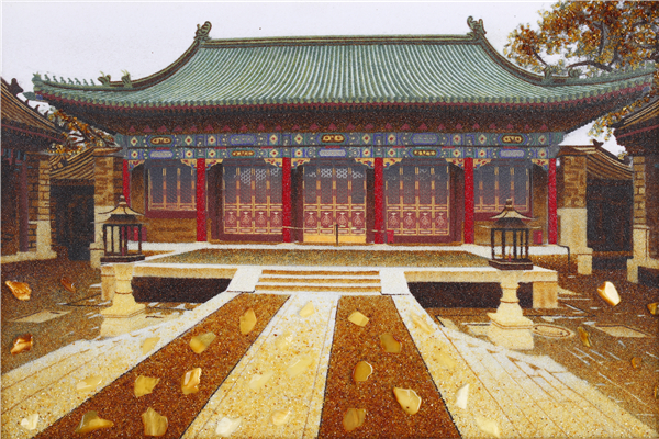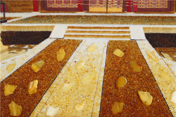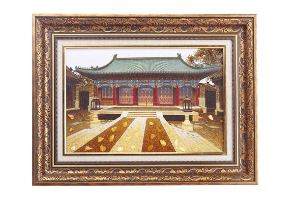 银安殿是恭王府的重要建筑,位于恭王府中路。将琥珀特有的天然宝石颜色与恭王府经典特色建筑结合,将古典建筑的朴素之美和王府的贵气展现得淋漓尽致。手工镶嵌的大颗粒琥珀,既增加了画面的立体感,使整幅画栩栩如生,也赋予画面富贵之路的美好寓意。