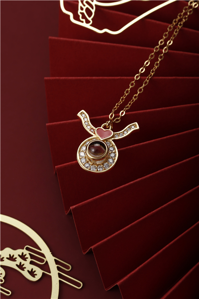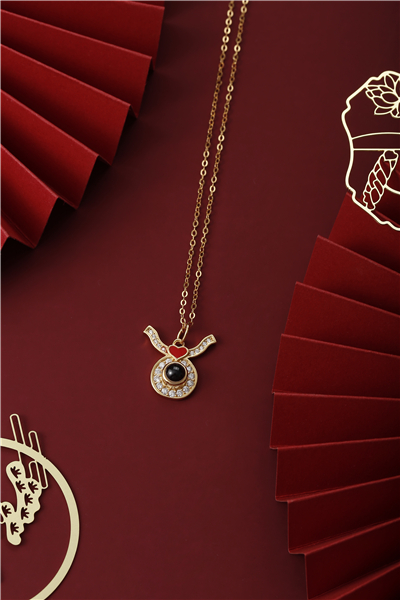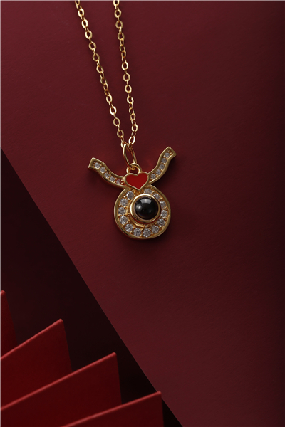 牛年新款,925银镀黄金材质。项链中央采用珐琅烤漆工艺,并利用微雕工艺将101个福字雕刻其中。项链造型灵感来源于星座中的金牛座,寓意牛年牛转乾坤,福在心头,鸿福天降。