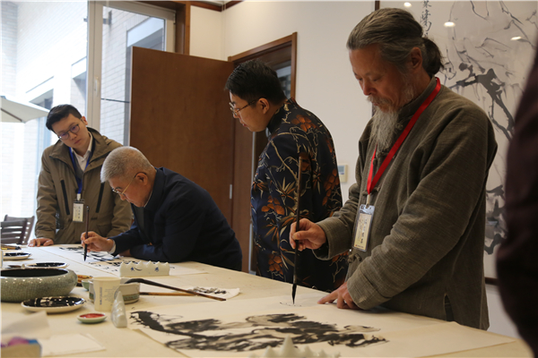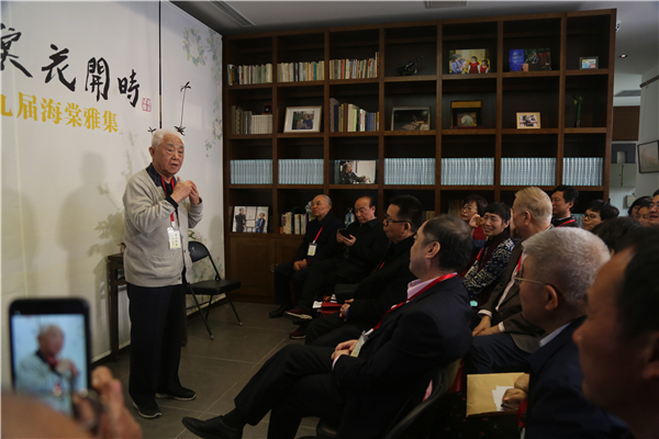 更有远道而来的卫斯理大学东亚系主任刘元珠、淡江大学教授施淑各自分享了追随叶先生学习诗词的往事;《人民日报》记者宋明霞深情诵读了短文《90岁之后的美谁负责》,回忆与叶先生的美丽相遇。中国新水墨画院著名画家仝凌飞将自己创作的海棠画作交由张静女士转赠叶先生。叶先生曾言:“声音里有诗歌一半的生命”,故本届雅集力邀众诗家以吟咏、诵咏或歌唱的形式分享作品,展现中华诗词文化音韵之美。中华优秀传统文化教育促进会秘书长刘琴宜即以现代音乐演唱了杜甫《绝句》《春旺》二诗,梁东、张福有也饶有兴致地演唱了诗词作品,同时伴有笔会交流,并将诗家创作的书画作品留与迦陵学舍,雅集现场气氛热烈。