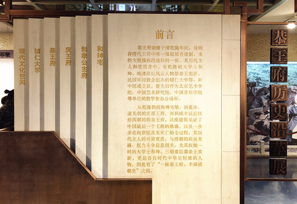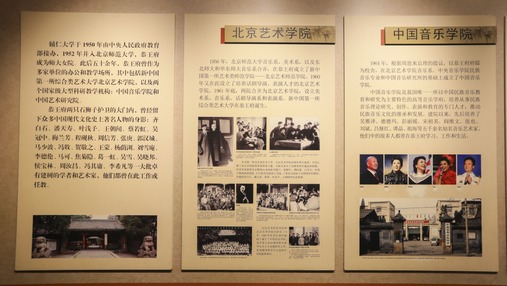 恭王府始建于清乾隆年间,是现存清代王府中唯一保留原有建制,未经大规模拆改破坏的一座。其历代主人和使用者中,有乾隆朝大学士和珅、晚清政坛风云人物恭亲王奕訢,民国年间教会创办的辅仁大学等。新中国成立后,曾先后作为北京艺术学院、中国艺术研究院、中国音乐学院等单位的教学和办公场所。