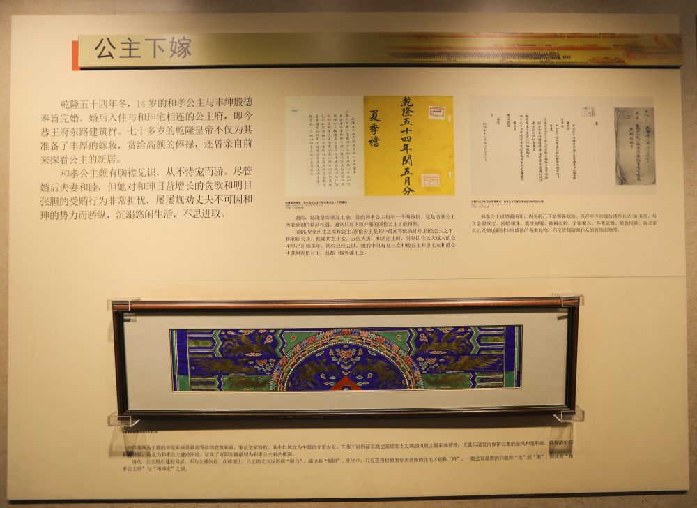 展览时间:2014年1月至今 展出地点:葆光室正殿 展览分为“和珅”、“恭亲王奕訢”、“私属皇室宅园”、“公共文化空间”四部分,全面介绍恭王府曾经作为和珅宅、和孝公主府、庆王府、恭王府、辅仁大学和现代文化空间的历史沿革情况。 展览同时展示:天花脊檩彩绘及地面旧有金砖。葆光室正殿天花彩绘保存完整,傅彩古雅,其中脊檩部分为清中期包袱式宋锦图案苏式彩绘,是难得一见的真迹。