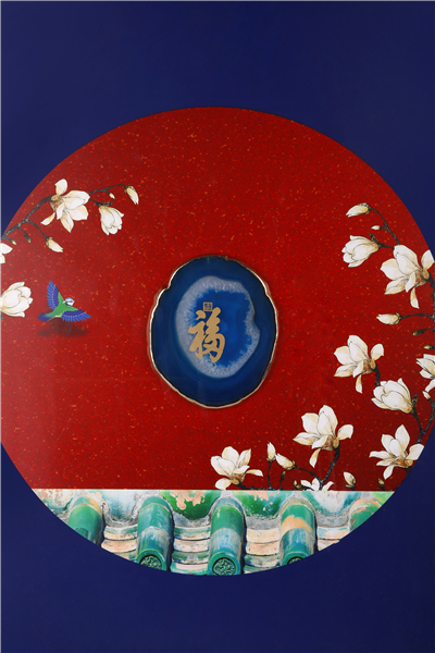 以恭王府中朵朵盛开的玉兰花和玛瑙为载体制作而成。玉兰代表玉福呈祥、玉堂富贵,装饰王府的红墙绿瓦,配以玛瑙天下第一福,传达了玛上有福、福禄蔓延、纳福迎祥、福玉满堂的美好祝福。