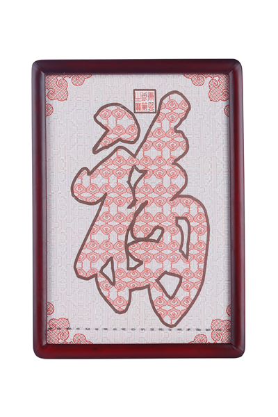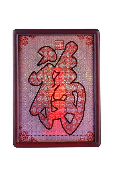 由人民币纸张制作而成,中间福字的勾勒采用人民币特有的渐变油墨工艺(磁光效应)。镂空部分为依次排列的红色祥云。此摆件最有创意的地方在于,在紫光灯照射下,中间会显现一尊观音。人民币纸张象征钱,加上福字,钱加福,寓意“全家福”。