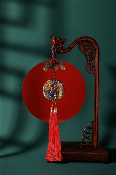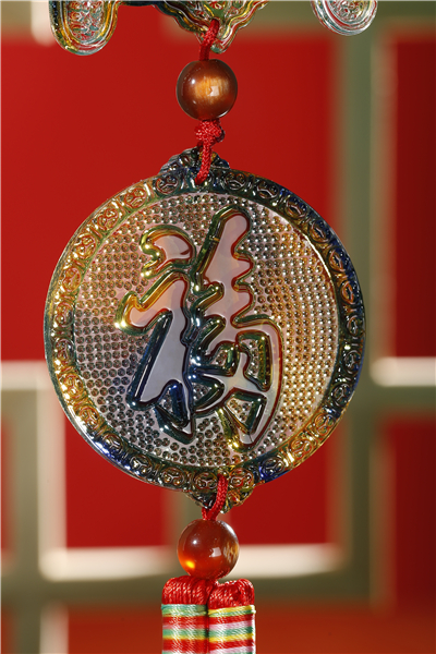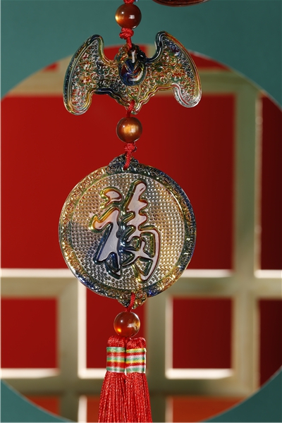 以蝙蝠和“天下第一福”为设计元素,属意福上添福。挂在车里寓意双福行运、与福同行,挂在家里寓意双福临门。