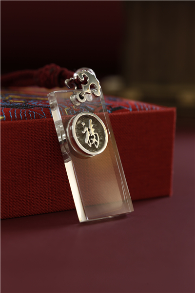 这款挂饰做工非常精致,中央的福字为手工双面雕刻,925银电镀18k白金材质。圆形图案代表团圆美满,镶嵌在白色水晶当中,干净明亮,可以直接佩戴在身上,起到装饰美观的作用,也可以当作护身符、平安符使用。经常佩戴水晶,会加强个人的灵感源泉,让思想更为敏捷。