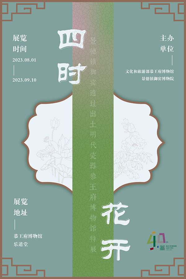 本次展览以恭王府四季景象为背景,从瓷器上的花卉植物主题和茶、酒、花、香等器用的角度,在古与今、恭王府与景德镇御窑之间展开一场关于美好精雅生活的“对话”;展示了在党和国家对文物保护工作的重视和几代文博工作者的艰辛奋斗下,历经沧桑的恭王府遗址和深埋地层的御窑瓷片,在新时代重现历史、文化和艺术光华的喜人成果。