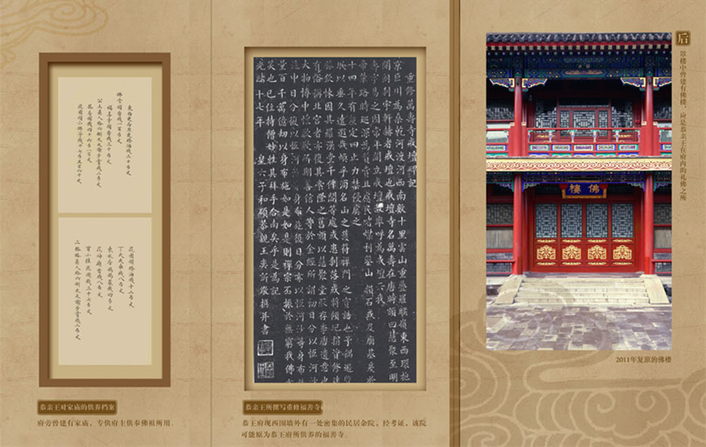 无论是出于统治的需要,还是因为个人的信仰,清朝的皇帝对佛教表现出不同程度的重视和笃信,尤其是藏传佛教。做为与皇宫关系最为密切的王府,其府主也必然对佛教有不同程度的信仰和尊礼。如庄亲王允禄,协助雍正及乾隆完成了多项佛教工程。果亲王允礼,笃信西藏宁玛派,精通藏文和蒙古文。