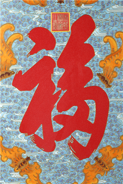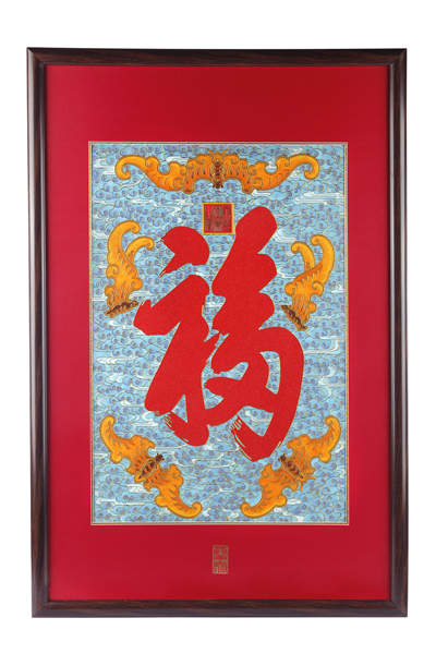 围绕中间“天下第一福”,挂画最上方为一只大大的蝙蝠,寓意福从天降,下方四只小蝙蝠寓意福气无边。整幅作品为纯手工制作,极具收藏价值。