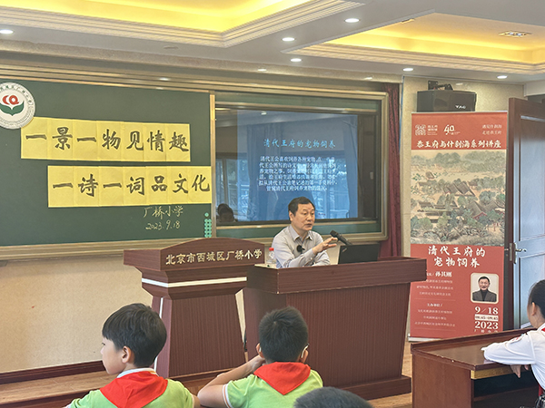 恭王府博物馆研究馆员孙其刚走进厂桥小学,以“一景一物见情趣,一诗一词品文化”为主题,以清代王公所写诗文为线索,引导孩子们发现清代王府生活中的乐趣。课堂中有很多互动环节,38名学生争相抢答,气氛热烈。学校1429人通过转播收看。