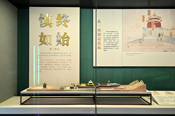展览的第三单元以“慎终如始”为题,展示了在清代各类烫样中地位最核心、设计最巧妙的品类——陵寝烫样。陵寝烫样的特殊地位源于皇帝对身后事的高度重视。关于陵寝,皇帝不仅会亲自确定选址,更深度参与从规制布局到细节装饰的全程设计。这使陵寝烫样必须做到可以精准传递皇家意志,不容丝毫偏差。陵寝烫样存世很少,本次展出的故宫博物院藏普祥峪地面、地宫建筑烫样,是清慈安太后陵寝的烫样,保存相对完整,较好地呈现了当时呈给太后审看时的面貌。本单元还展出了根据德国柏林工业大学建筑学院提供的3D扫描数据制作的德国民族学博物馆藏清惠陵(同治皇帝陵寝)明楼地宫3D打印模型。为完整呈现陵寝的立体结构与建造逻辑,其中每一个构件都是可以拆卸的设计。模型的每个构件分开摆放,令观众一睹其中奥妙。同时展出的还有故宫博物院藏养心殿戏台烫样,是同治皇帝病重时为其祈福和供其娱乐而设计的。