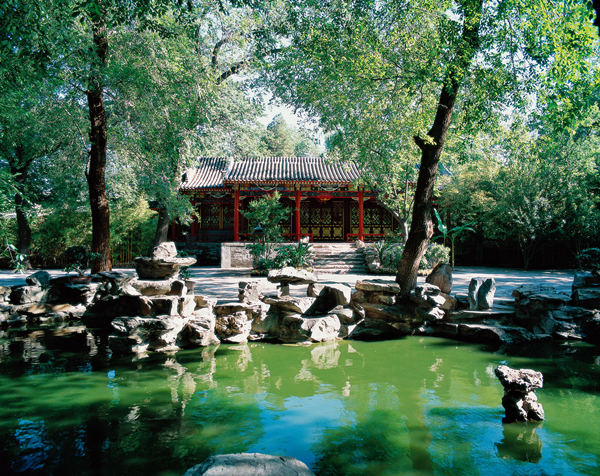 安善堂前出抱厦,后带平台,两侧有游廊通向东西两庑。它在园中蝠池、邀月台、水榭、大戏楼等建筑的簇拥下,显得富贵堂皇,景致优美。这里原是主人游园时吟诗、作画的地方,也曾是恭亲王奕訢宴请重要宾客的处所。