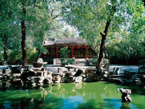 在清代的北京,往私宅中引入活水,是要经皇帝特批的,恭王府是少数几个获此殊荣的王府之一。这个用青石围砌成的蝙蝠形大水池,旧名为“蝠河”,后称“蝠池”,又因形状像元宝,也称元宝池。水池的周围种满了榆树,每到春夏之交,榆荚飘落,状似铜钱的“榆钱儿”落满蝠池,谐音“福钱”满盈,寓意是福贵双全。