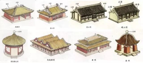 作为古建筑中重要组成部分的屋顶,其分类可谓种类繁多,可分为以下几种形式:庑殿顶、歇山顶、悬山顶、硬山顶、攒尖顶、盝顶等,其中庑殿顶、歇山顶、攒尖顶又分为单檐(一个屋檐)和重檐(两个或者两个以上屋檐)两种,歇山顶、悬山顶、硬山顶可衍生出卷棚顶。