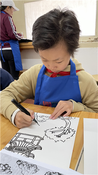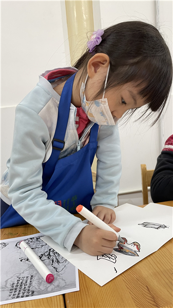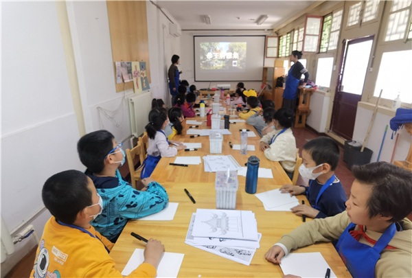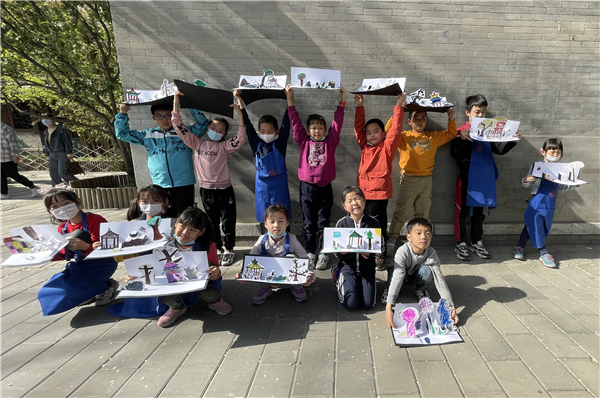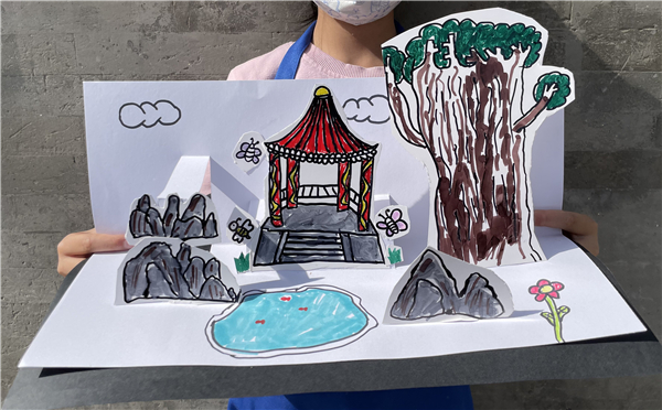 参观过后是教学环节,小朋友们在老师的讲解下进一步了解中国古典园林造景艺术,体会“虽由人作,宛自天开”的艺术效果。结合恭王府园林造景制作立体绘本,小朋友们在动手中体会园林中山、石、树、屋相互组合的美感。