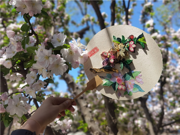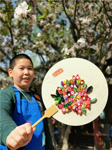 参观过后,老师在教室里为大家介绍海棠花所代表的吉祥寓意“子孙满堂”,并指导每位同学发挥自己的创意,通过衍纸的手法,制作美丽的海棠花团扇,让同学们在慢制作的过程中体会海棠之美与雅集氛围,感受恭王府历史文化内涵。