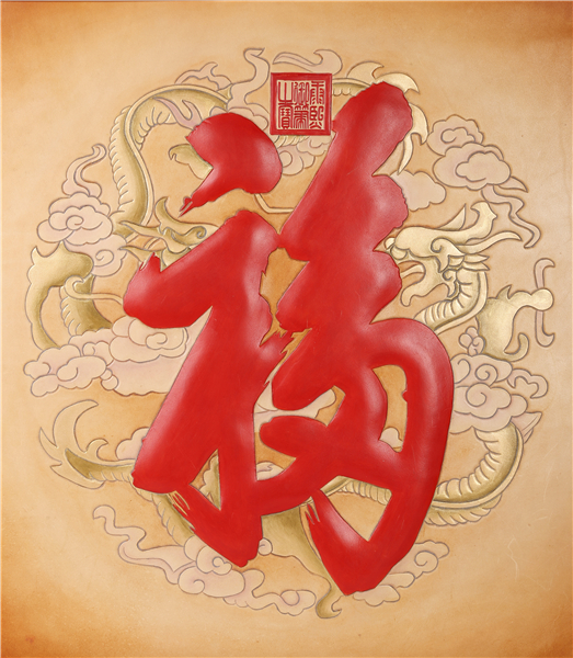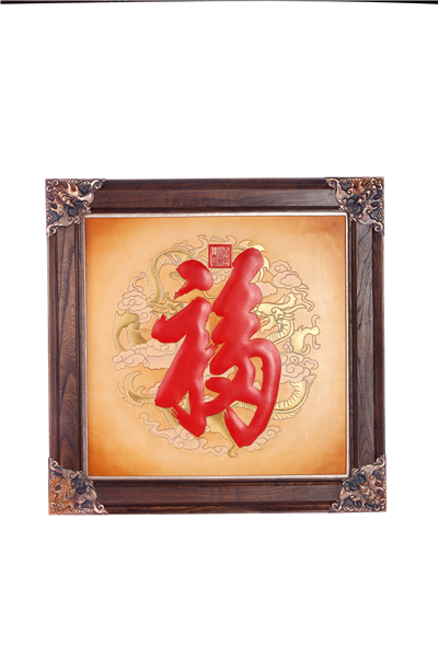 画框四个角采用蝙蝠元素,寓意四方来福。铜制的蝙蝠让作品更有视觉感。四只蝙蝠与中间福字组合,寓意“五福临门”。