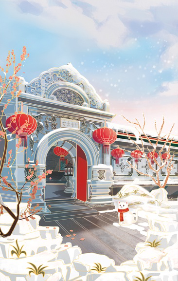 “不知庭霰今朝落,疑是林花昨夜开。”纷纷飘雪落在了西洋门的肩头,凝结成绽放的冰花,典雅的西洋门被装饰上了靓丽的福牌与福灯,照亮了一片皑皑的雪景,即使是凛然的景色,也能重新被人们的期待与祝福温暖。