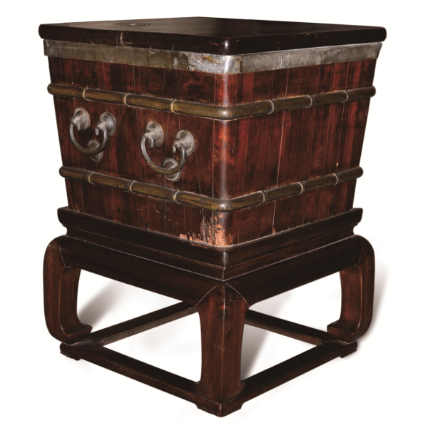 柏木制,上有一对箱盖,盖上有四个铜钱纹开光,用于将箱盖提起。箱内四壁均用铝皮包镶,并设有一层格屉,由两个长方形格屉组成。冰箱外壁铜箍三道,两侧面安有铜提环。箱下承柏木座,座面有束腰,四角及鼓腿拱肩部均包镶铜片,足下连托泥⑸。