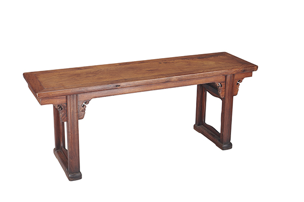 黄花黎木制。案形结体,座面攒边打槽装独板面心,底装三根穿带,用以承托案面,边抹立面为混面,且向下内敛至底边起线,中部有一浅凹槽,面下装素牙板、云纹牙头,前后牙板末端封以牙堵,牙板、牙头沿边起阳线,线脚交圈,牙头饰转珠阳线。方材直腿,四腿上部侧面开口嵌夹牙头、牙板,顶端出榫上承案面,腿足外侧混面起边线,中起一道阳线,俗称“一炷香”。前后腿横枨间装绦环板,挖渔门洞,下装冬瓜樁式挡板,腿下端落有托泥。早年为德国学者艾克先生收藏,在其1944年出版的《中国花梨家具图考》曾有著录。2006年由艾克夫人曾佑和女士捐赠给恭王府博物馆。
