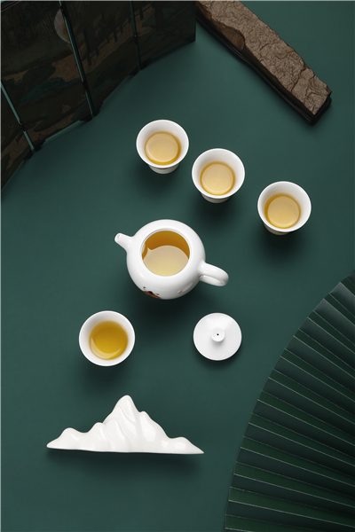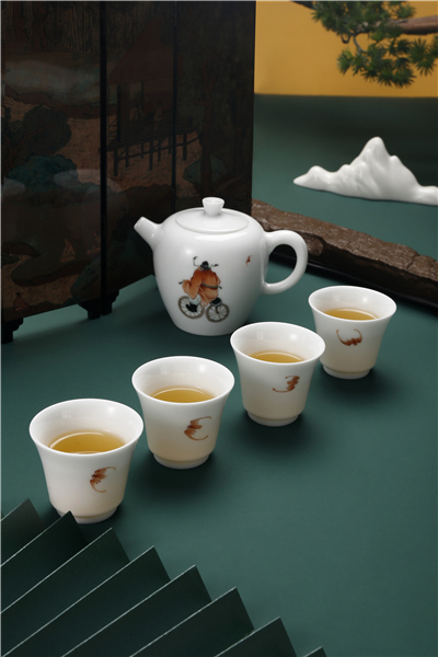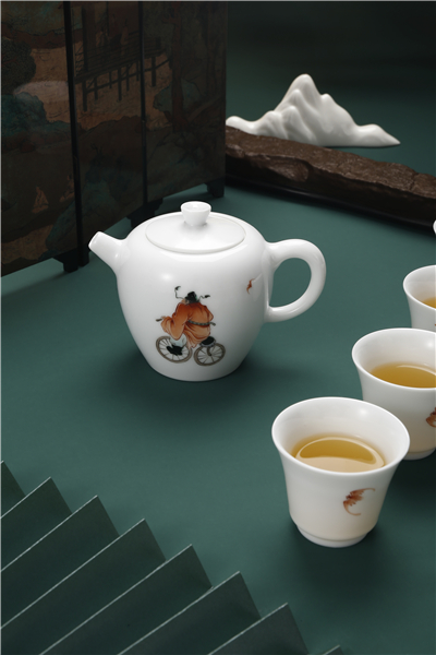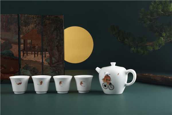 茶具上的图案为骑自行车的钟馗,四只杯子上有四只蝙蝠,与茶壶上的蝙蝠共同组合为五福,寓意五福临门。钟馗与福相伴,寓意美好、祥瑞。