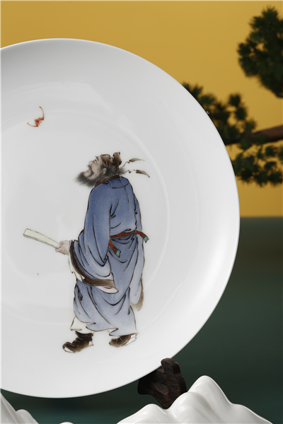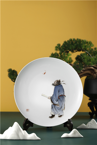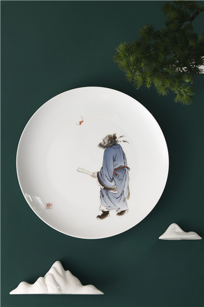 钟馗纳福系列茶具赏盘,盘中钟馗慈眉善目,与蝙蝠相伴,寓意抬头见福、福在眼前。