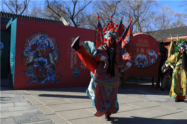 开幕式上,河南省滑县大平调剧团精彩演出《大升帐》剧目,楚小龙、常洁、赵自勋、刘强共同为展览击鼓开幕。