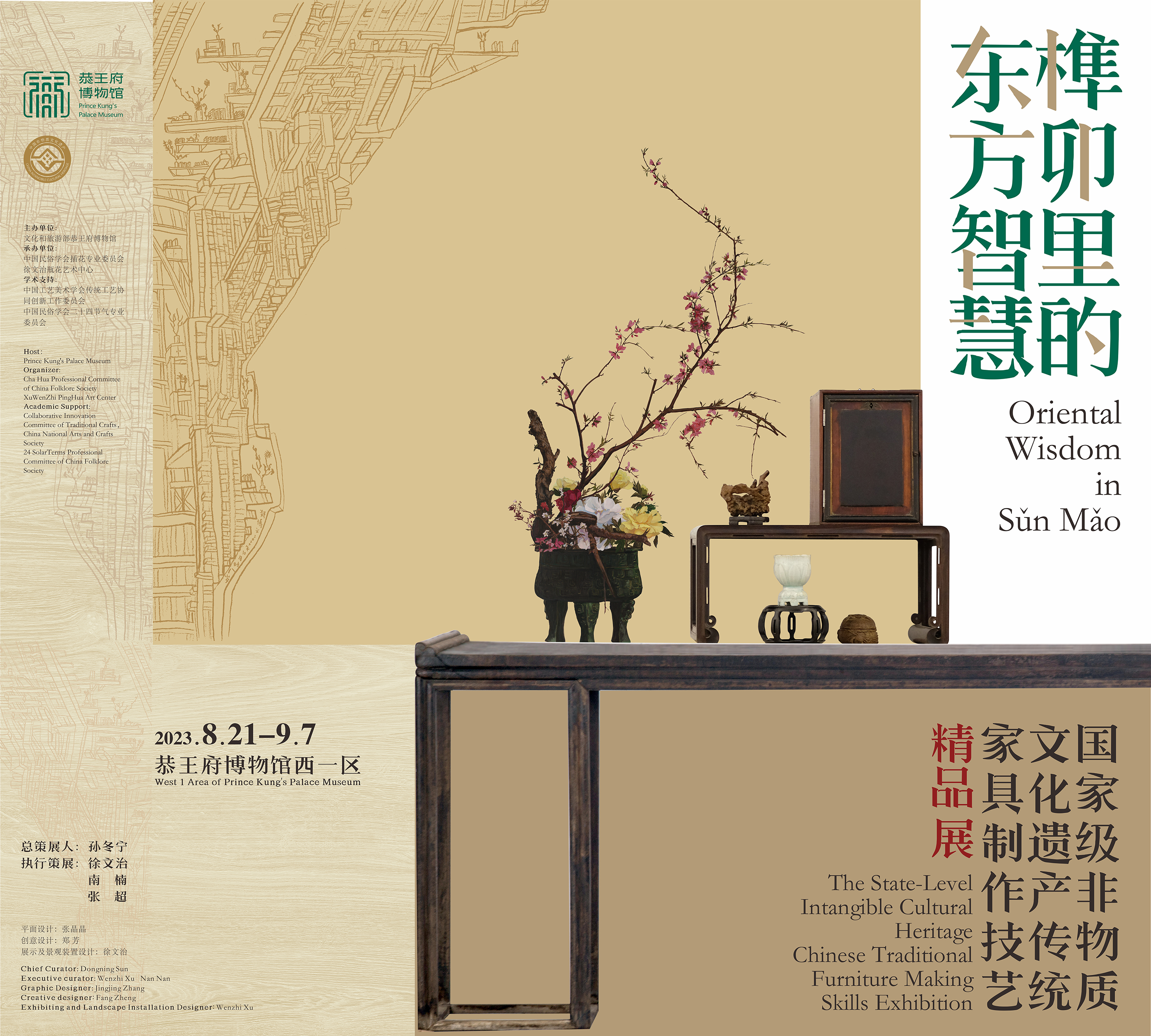 本次展览共分为“东方智慧”“京华甲第”“苏州造物”“岭表华章”“续古为潮”五个单元,展出精品家具作品六十余件(套),结合书画、瓶花、古琴、香具和三地特色的器具文玩,以静态展览、动态展示、活态展演等方式,探讨家具与空间的构成关系,构建中华生活美学空间,为优秀中华生活方式在当代语境的重置提供范式。